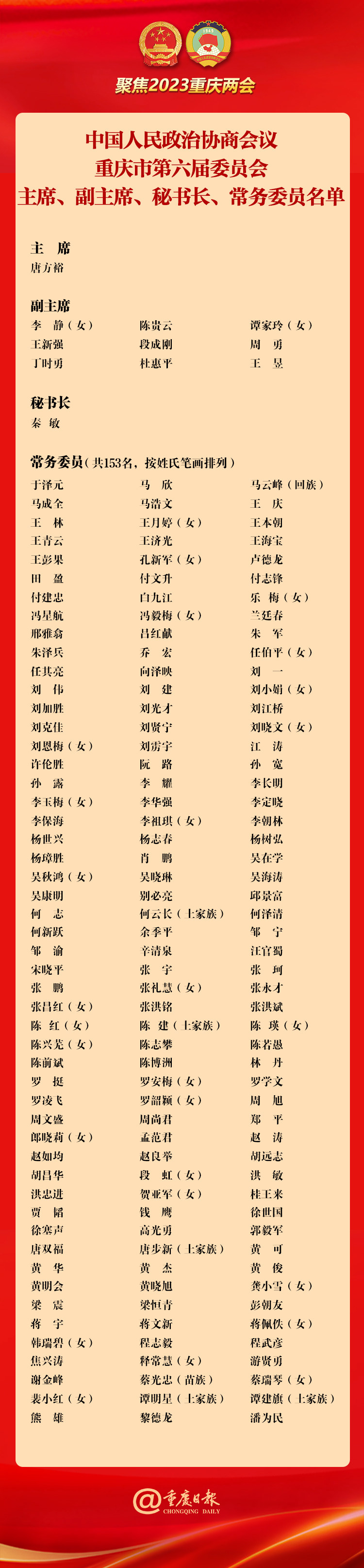在闭幕会前举行的选举会上,唐方裕当选为政协重庆市第六届委员会主席,李静、陈贵云、谭家玲、王新强、段成刚、周勇、丁时勇、杜惠平、王昱当选政协重庆市第六届委员会副主席。秦敏当选为政协重庆市第六届委员会秘书长。于泽元等153人当选为政协重庆市第六届委员会常务委员。